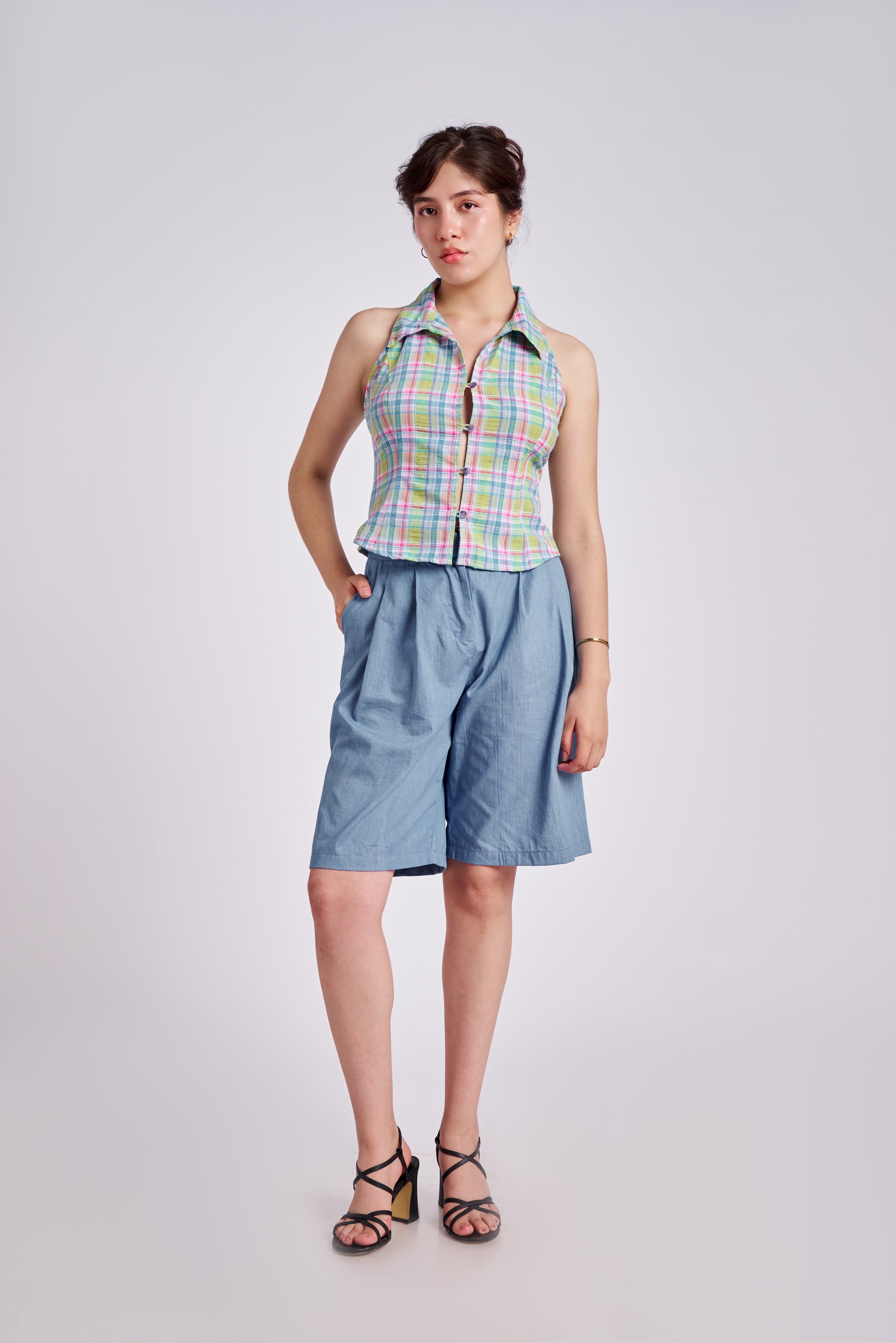 La Bermuda Susana se atreve a romper las reglas de los básicos. Cintura alta, pinzas audaces y una pierna amplia que desafía una pieza clásica: esta es una bermuda que trae modernidad, comfort y frescura para la temporada. Bolsillos profundos y basta ancha completan una silueta que grita confianza.