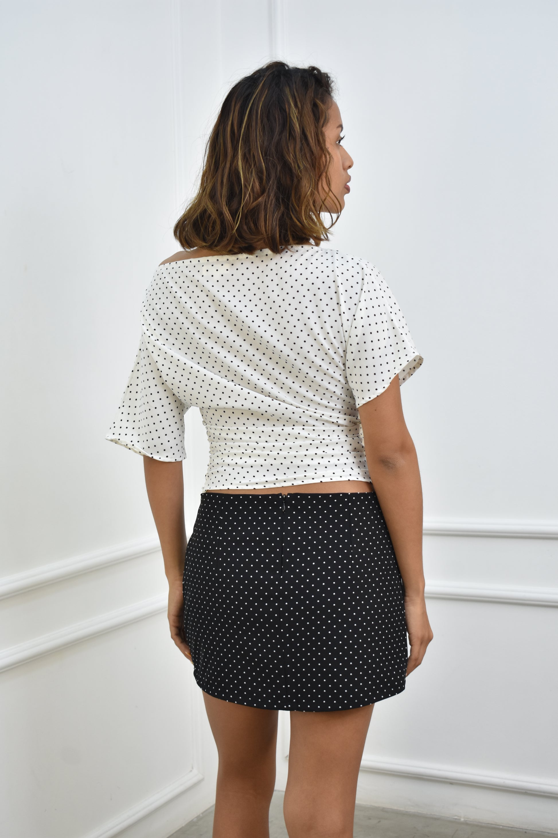 Cute! Esta minifalda de lunares de corte a la semi cadera es un esencial en tu clóset. El estampado de lunares le da un toque clásico y chic. Incorpora shorts para mayor comodidad y un cierre discreta lateral. Perfecta para combinar con una blusa holgada o un top ajustado, según tu estilo personal.